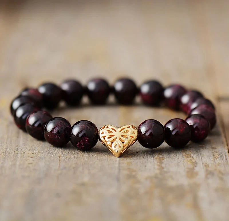 Handmade from 10mm natural Garnet beads and with a heart charm, this is a premium bracelet of unique beauty.